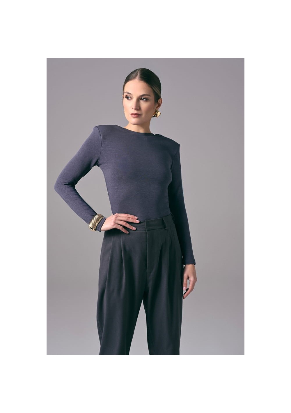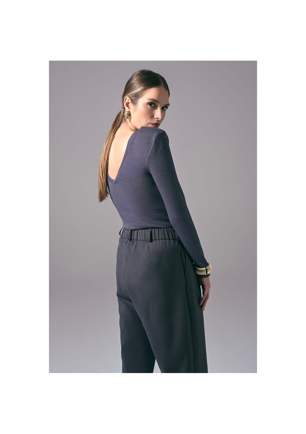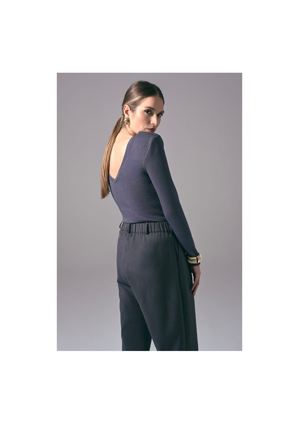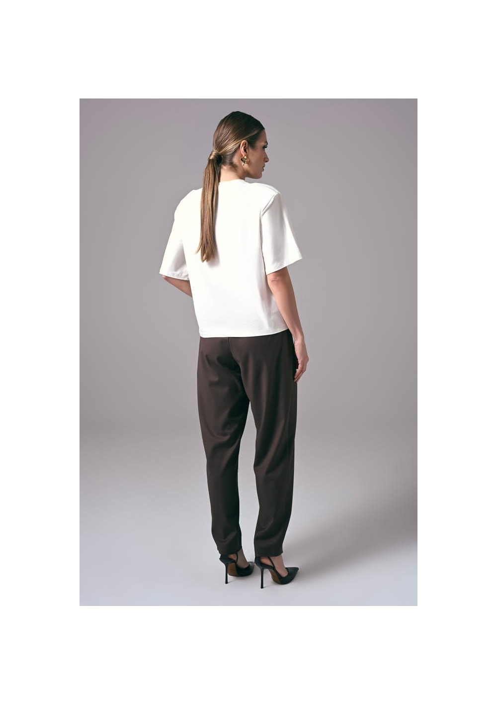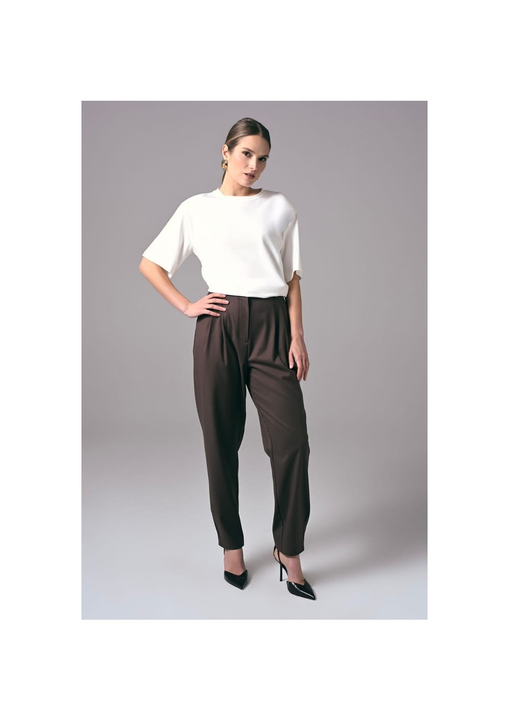 Dwie zaszewki z przodu oraz dodatkowa zaszewka przy dole nogawki utrzymują formę spodni przez cały dzień.