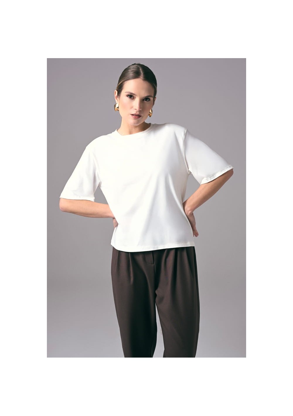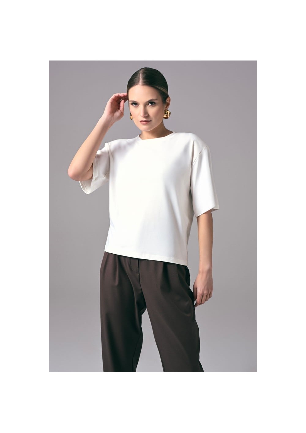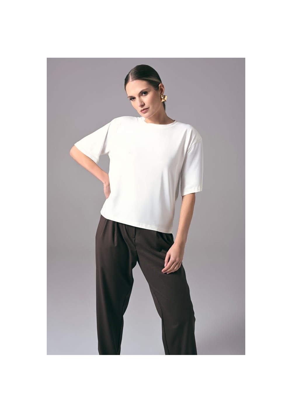 Lekko zaokrąglona linia nogawki buduje nowoczesną sylwetkę i nie opina nóg, zachowując elegancki charakter.